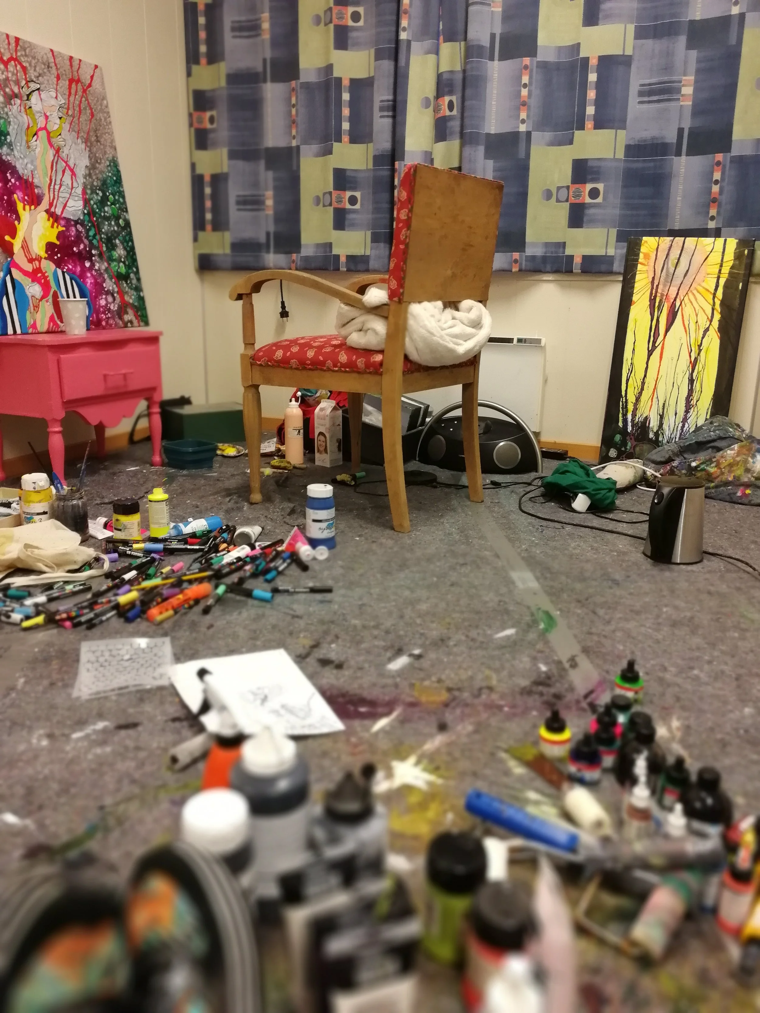 Begynner med litt bilder fra verkstedet mitt på Berger.. Hvis man ikke tåler rot å kaos så er denne bloggen nok ikke noe for deg..;-) Jeg er et rotehode og jeg kan skrive under på at min mann ofte river seg i håret av frustrasjon over min manglende evne til system og orden.. På hjemmebane prøver jeg så godt jeg kan og holde en viss orden (syns jeg selv ihvertfall) men jeg vet at jeg er håpløs.. Poenget mitt er at her på verkstedet er jeg min egen kvinne, ingen som forventer at ting skal være på en spesiell måte. Her kan jeg gjøre akkurat som jeg vil det er en befrielse og en medvirkende faktor til at kreativiteten er på topp når jeg er her..:-) Jeg er så heldig at jeg har fått leie et gammelt keramikkrom på en nedlagt skole.. Heldigvis har deler av bygningen blitt til barnehage så jeg er ikke helt alene, ovenpå høres barneføtter, skrik og skrål..